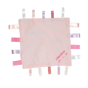 This comforter is super soft fleece on one side and soft cotton on the other. The ribbons give different tactile feelings to explore